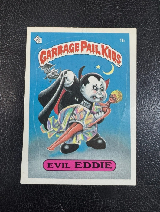 Dive into the irreverent world of Garbage Pail Kids with the 1985 Topps Series 1 trading card featuring the iconic character, Evil Eddie. This collectible card, numbered 1b, showcases the classic and whimsical art style that has captivated collectors for decades.